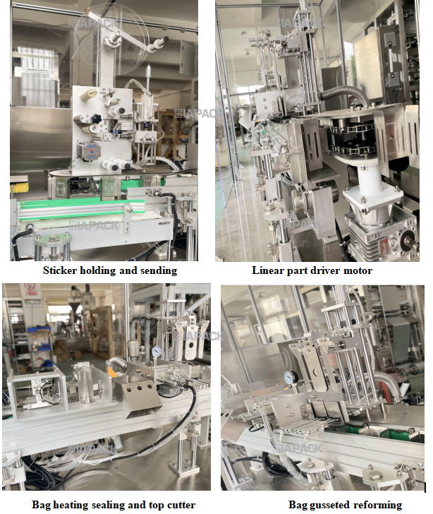 මෙම යන්ත්රය ඉහළ ලේබල් කිරීම සහිත ගුසෙට් බෑගය සෑදීම සඳහා විශේෂ සැලසුමකි. නිෂ්පාදන සහිත සම්පූර්ණ බෑගය මෙම යන්ත්රයට වැටුණු පසු.මෙම යන්ත්රය බෑගය රැගෙන, වන් ටයිම් බෑග් කට නැමීම හරහා ගොස් ලේබලය ඇලවීම සිදු කරයි. SUS304 .පීඑල්සී සහ ස්පර්ශ තිරය Siemens සන්නාමය විසින් භාවිතා කරයි .සහ වායුමය කොටස් SMC සන්නාමය භාවිතා කරයි .ප්රධාන විදුලි උපාංග Omron සහ Schneider සන්නාමය භාවිතා කරයි.මෙම යන්ත්රය ස්වයංක්රීය ඇසුරුම් යන්ත්රය සමඟ ක්රියාකරමින් නිමි බෑග් ටොප් ලේබල් කිරීම වෙත ළඟා විය හැක. ලේබලය වෙන් කර ඇත ,ලේබලය යැවීම .ලේබල් අනාවරකය සහ ලේබලය එබීම .