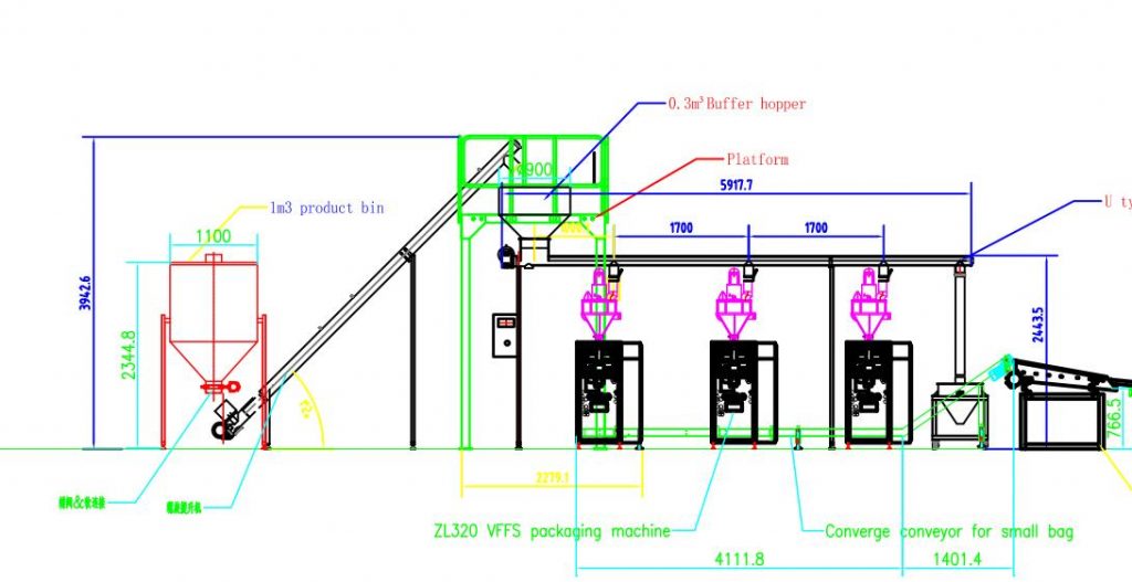1, Samll බෑග් සාදන පිරවුම් ඇසුරුම් යන්ත්රය .මෙම කොටස අමුද්රව්ය ආප්ප, ආනති ඉස්කුරුප්පු පෝෂක යන්ත්රය .මැද බෆර් ආප්ප සහ තිරස් පෝෂණ ඉස්කුරුප්පු ඇණ ඇතුළුව සියලුම අමුද්රව්ය කට්ටල 6 ට යැවීම සඳහා Auger මනින යන්ත්රය