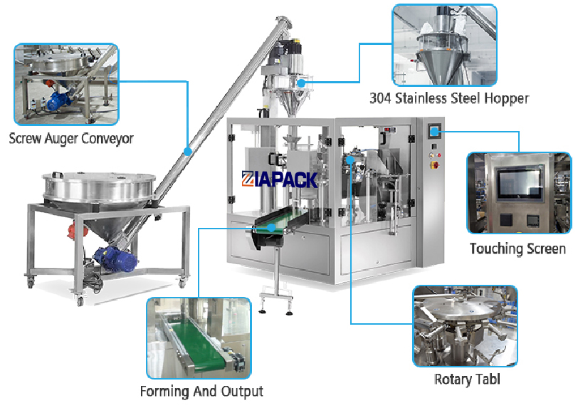 Augur Filler සහ Screw Elevator සමඟ අත්වැල් බැඳ ඇති අතර එය ඩිටර්ජන්ට් පවුඩර්, කිරිපිටි, පිටි, කුළු බඩු, කොකෝම් කුඩු, බිම් කෝපි ආදිය වැනි පැකට් කිරීම සඳහා පුළුල් ලෙස යොදා ගැනේ.